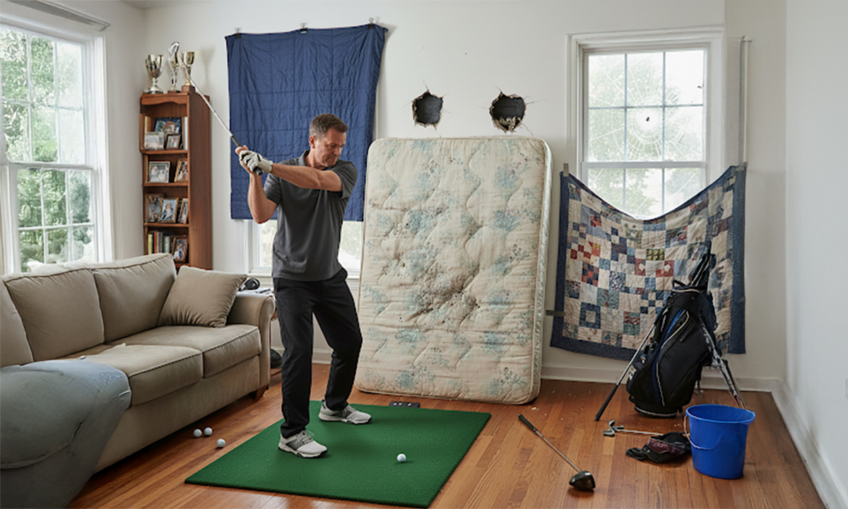 Chipping indoors is a little trickier, you don’t want holes or dents in your plaster. When I first got home from the military, I had a long sunroom with ceilings high enough to take a full swing. Unfortunately, it was all windows. I put two old mattresses on their sides at the far end of the room and draped a heavy quilt from the ceiling to absorb the flight of the golf balls off my driver. The first time my mother visited, all she had to say was, “I’m glad you don’t live with me anymore.” The point is, find somewhere that allows you to practice without causing damage. More than likely you’ll be hitting shots from a tight lie, so experiment with your wedges, finding setups that allow the clubhead to move smoothly through the ball. The great thing about practicing putting and chipping indoors is that you can still watch football or whatever else you like while you do it.